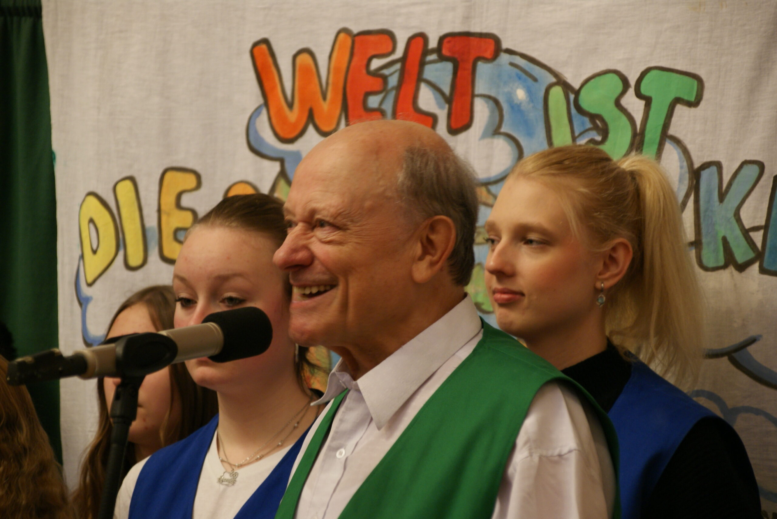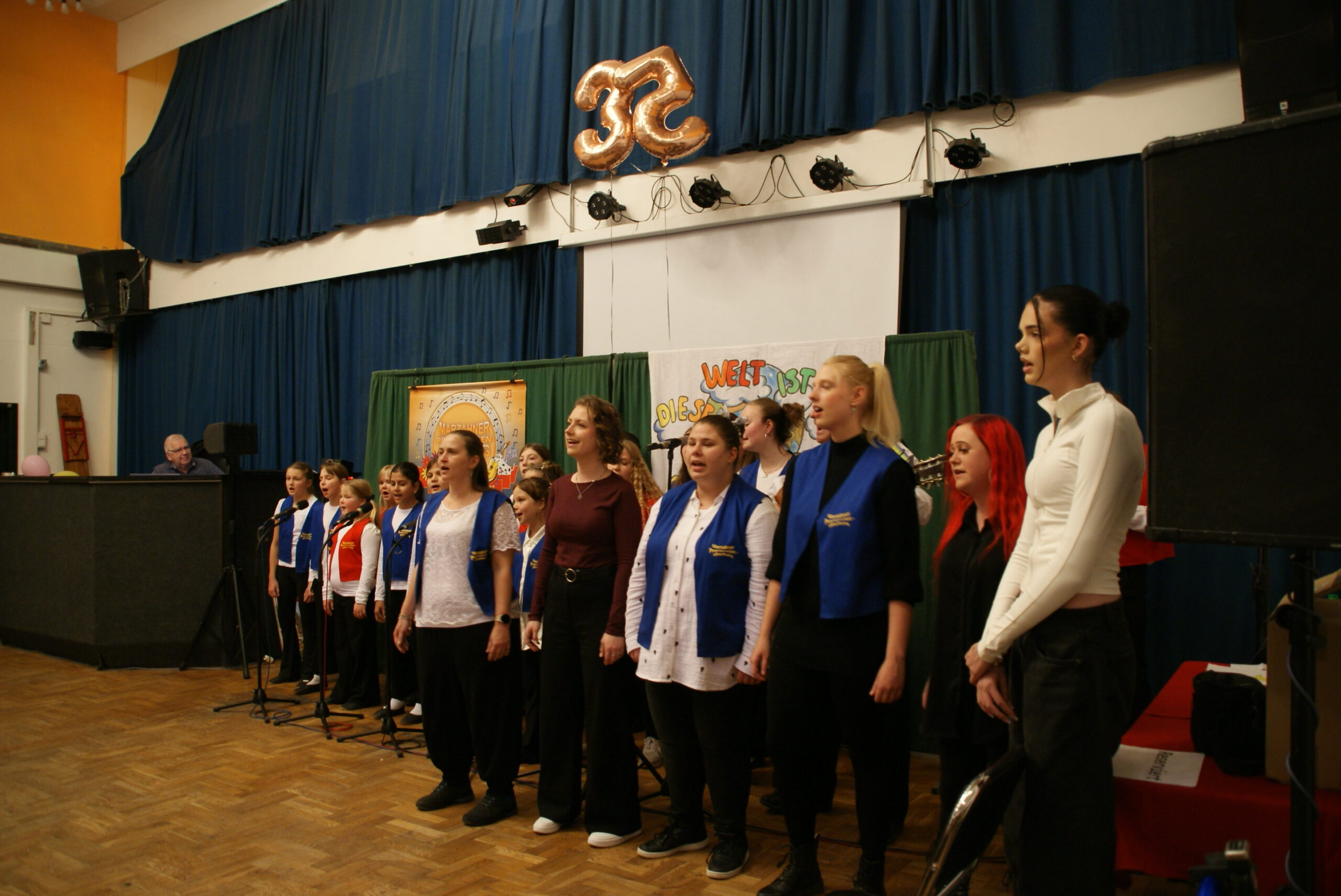 Kundencenters Nordost der degewo, Frau Miethe, den Vereinsvorsitzenden der Freunde der Gärten der Welt, Herrn Pritzlaff, die Leiterin des Stadtteilzentrums Marzahn-Mitte, Frau Polizzi, die Leiterin des Chorstammtischs, Frau Neuberger, und als Ehrengäste den DJ Jörg Schäfer und Xenia Ilina als Leiterin des Tanzstudios „Konfetti“. Beim Eröffnungslied „Marzahner Promenaden-Mischung“ und beim Titel „Die Erde ist ein Ball“ sangen sechs ehemalige Chorkinder mit, die zugleich eindrucksvoll 35 Jahre Chorgeschichte verkörperten. Die Moderatorinnen Leonie, Lea Sophie und Leonora führten durch das weitere Programm. Danach erfreute die Tanzgruppe der Sechs- bis Siebenjährigen von „Konfetti“ das Publikum mit ihrem Tanz „Partymaker“. Bei den anschließenden Liedern des Programms „Diese Welt ist klein“ sangen und klatschten die Gäste mit. Großen Spaß bereiteten das „Geburtstagslied“, das Lied „Mein Herr, wie steht’s mit Ihnen?“ und das Quodlibet „O du lieber August“, bei dem das Publikum aktiv einbezogen wurde. Viel Beifall erhielt die Tanzgruppe der älteren Mädchen für die Darbietung ihres Tanzes „Bushaltestelle“. Fleißig mitgeschnipst wurde beim anschließenden Lied „Da liegt Marzahn“. Für die Präsentation „Die Gärten der Welt“ mit den acht Schildern erhielten wir wieder starken Applaus. Für einen stimmungsvollen Abschluss des ersten Teils des Jubiläumskonzerts sorgte das Lied „Ech nanina“, bei dem der ganze Saal mitsang und -klatschte.