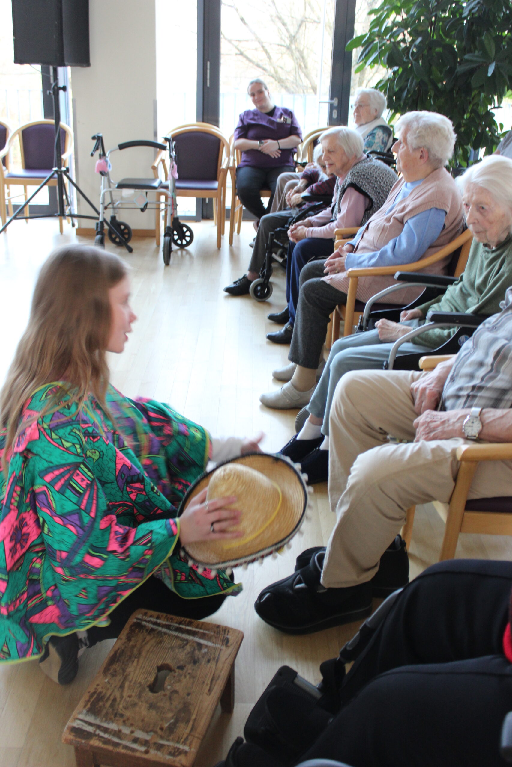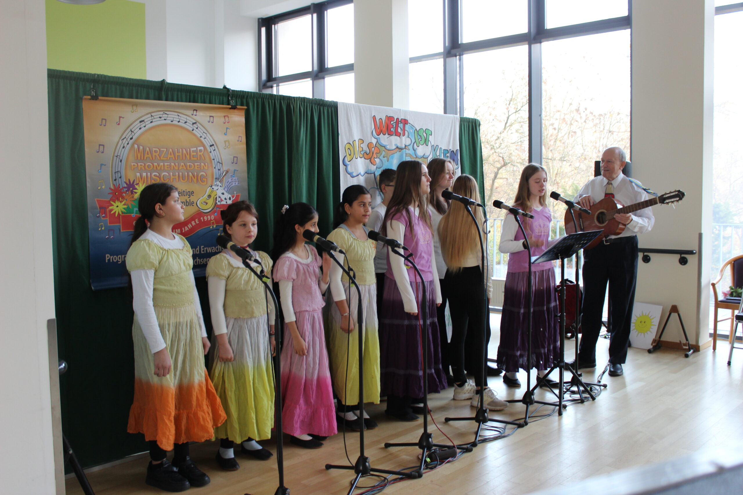 Auf Einladung der Pflegedienstleitung der Seniorenwohnwelt Zühlsdorfer Straße boten wir am 8. November zum letzten Mal unser aktuelles Programm im Speisesaal vom „Haus Alpenland“ dar. Mit neun Chorkindern begeisterten wir die über 50 Heiminsassen, Betreuerinnen und Gäste vom ersten Titel an zum Mitsingen und Klatschen. Große Freude bereitete Leonora den Senioren durch ihr Schuheputzen beim Lied „In San Juan“. Wie immer gab es starken Beifall beim Lied „Die Gärten der Welt“, nach den Tanzgestaltungen und zum Schluss unseres Auftritts. Viele Heimbewohner bedankten sich danach persönlich bei den Chorkindern und Erwachsenen und äußerten den Wunsch nach weiteren Konzerten.