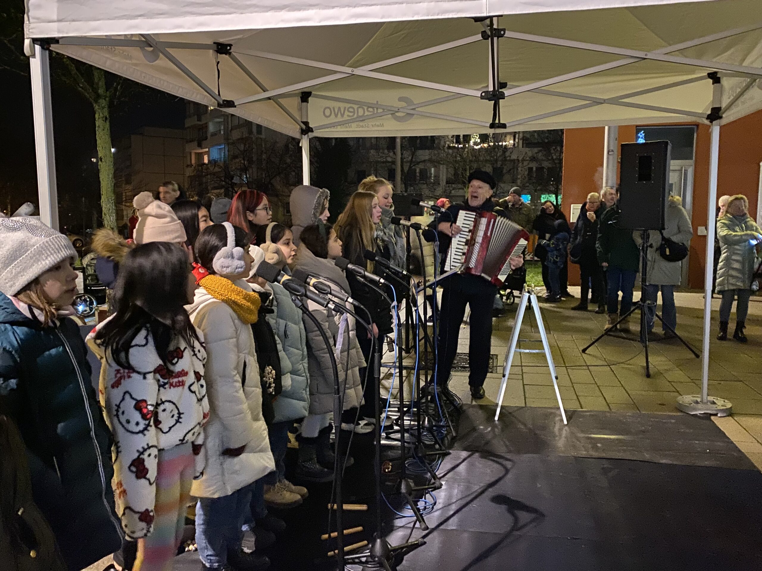 Im Rahmen der von der degewo geförderten Christmas Promenade traten wir unter der weihnachtlich geschmückten Tanne neben dem Eiscafé „La Gondola“ in der Marzahner Promenade 31 auf. Nachdem es tagsüber geregnet hatte, konnten wir unser halbstündiges Programm zum Glück bei trockenem Wetter darbieten. Mit 14 Chorkindern sangen wir vor allem stimmungsvolle Lieder, bei denen das Publikum von Anfang an freudig mitsang und klatschte. Besondere Aufmerksamkeit fand das Lied „Weihnacht ist da“, das Leonie mit der Trommel begleitete. Zum Schluss wurden wir mit starkem Beifall verabschiedet. Als Dank erwärmten sich alle Mitwirkenden  bei einer Tasse heißem Kakao. mehr…