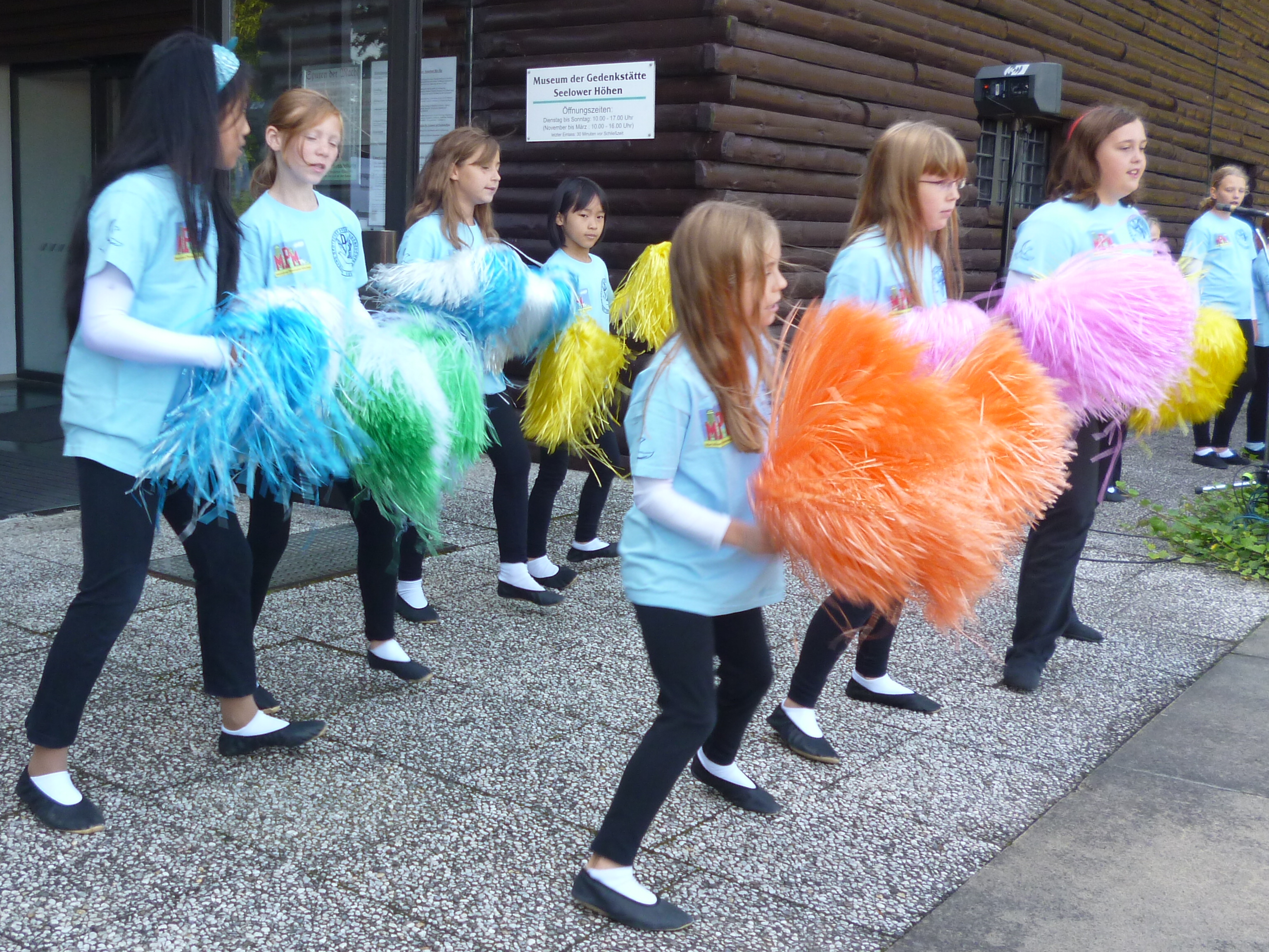 Anschließend konnten sich alle Chorkinder und Erwachsenen bei einem Mittags-Imbiss mit Bratwurst und Pommes stärken, das Gelände der P1110204Gedenkstätte erkunden und ein bisschen ausruhen. Danach P1110220bereiteten wir uns auf den zweiten Auftritt mit einem Musik- und Tanzprogramm gemeinsam mit der Tanzshow „Swentana“ vor. Wir boten Lieder und Tänze unseres Programms „Wir sind die Besten!“ mit der Moderation von Trixi, Jennifer und Ly vor. Beim Abschlusstitel „Auf Wiedersehn“ winkten alle Chor- und Tanzkinder dem Publikum zu. Leider schauten P1110210uns nur sehr wenige Besucher der Gedenkstätte zu.P1110225